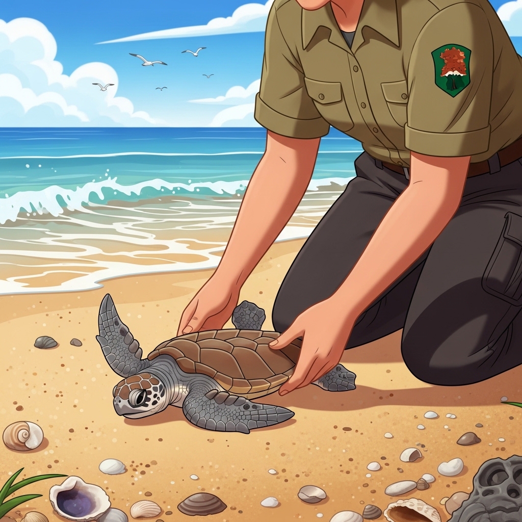 작은 거북이가 등에 뒤집혀 무방비 상태가 되자 관리인이 조심스럽게 다시 세워 준다.