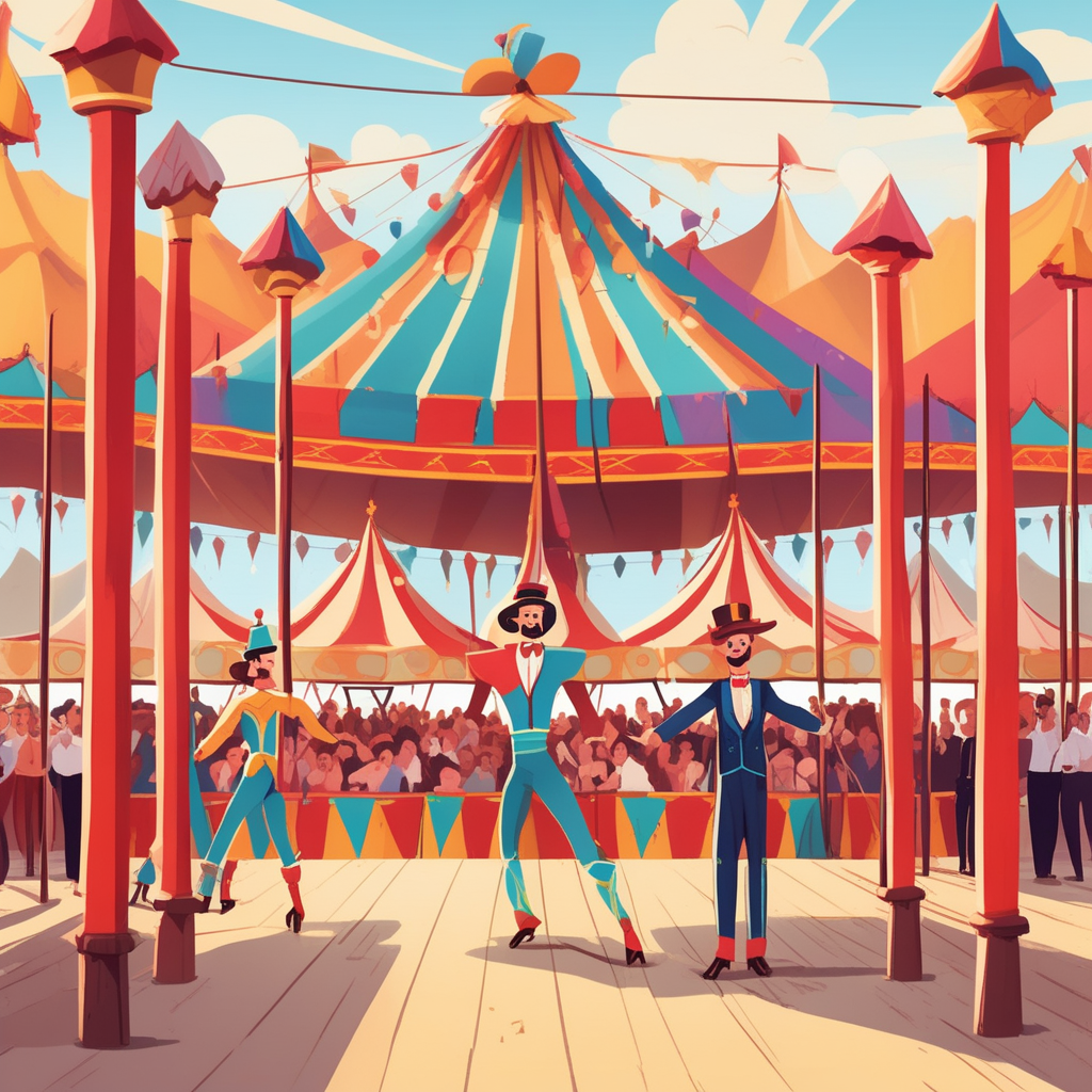 "The street performer on stilts towered above the crowd like a friendly giant collecting coins in his hat."