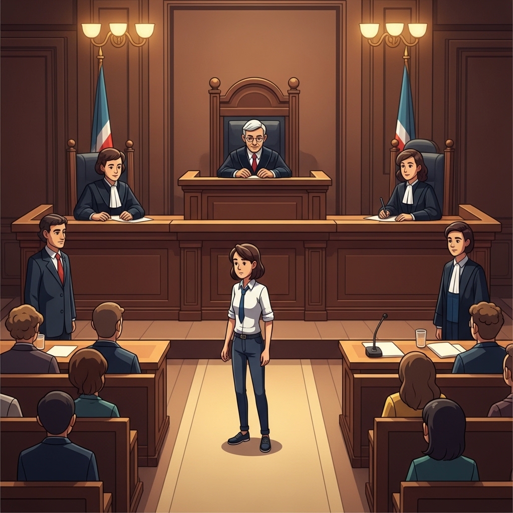 피고인이 법정에서 서 있고 판사가 사건을 듣고 있다.