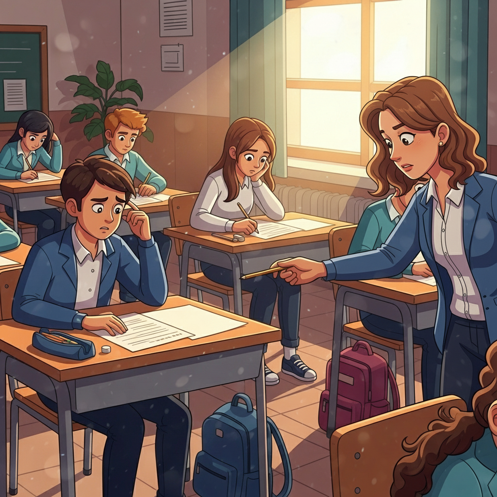 시험 중 학생이 연필이 없다는 것을 깨닫고 친구에게 빌린다.