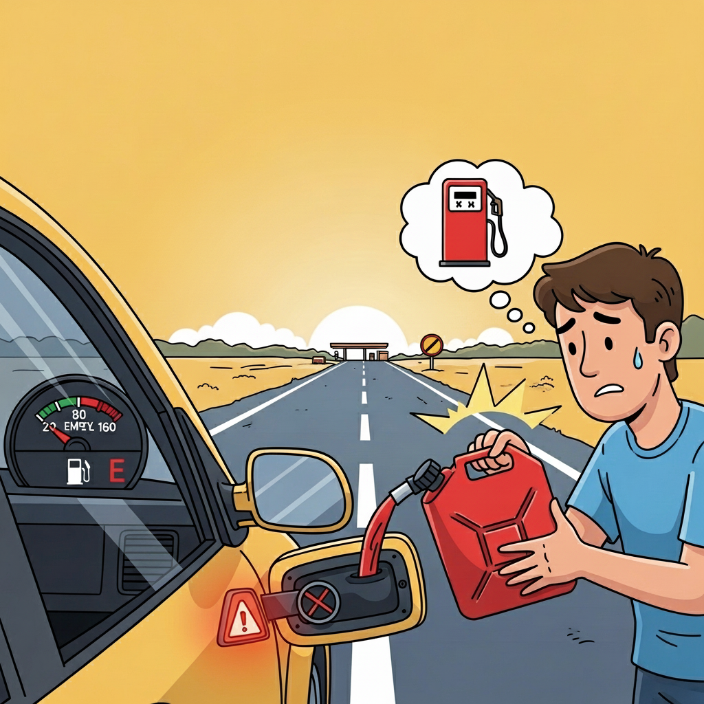 운전자가 연료가 떨어져 예비 휘발유통으로 차에 기름을 넣는다 — 기름이 부족하면 여정이 멈춘다.