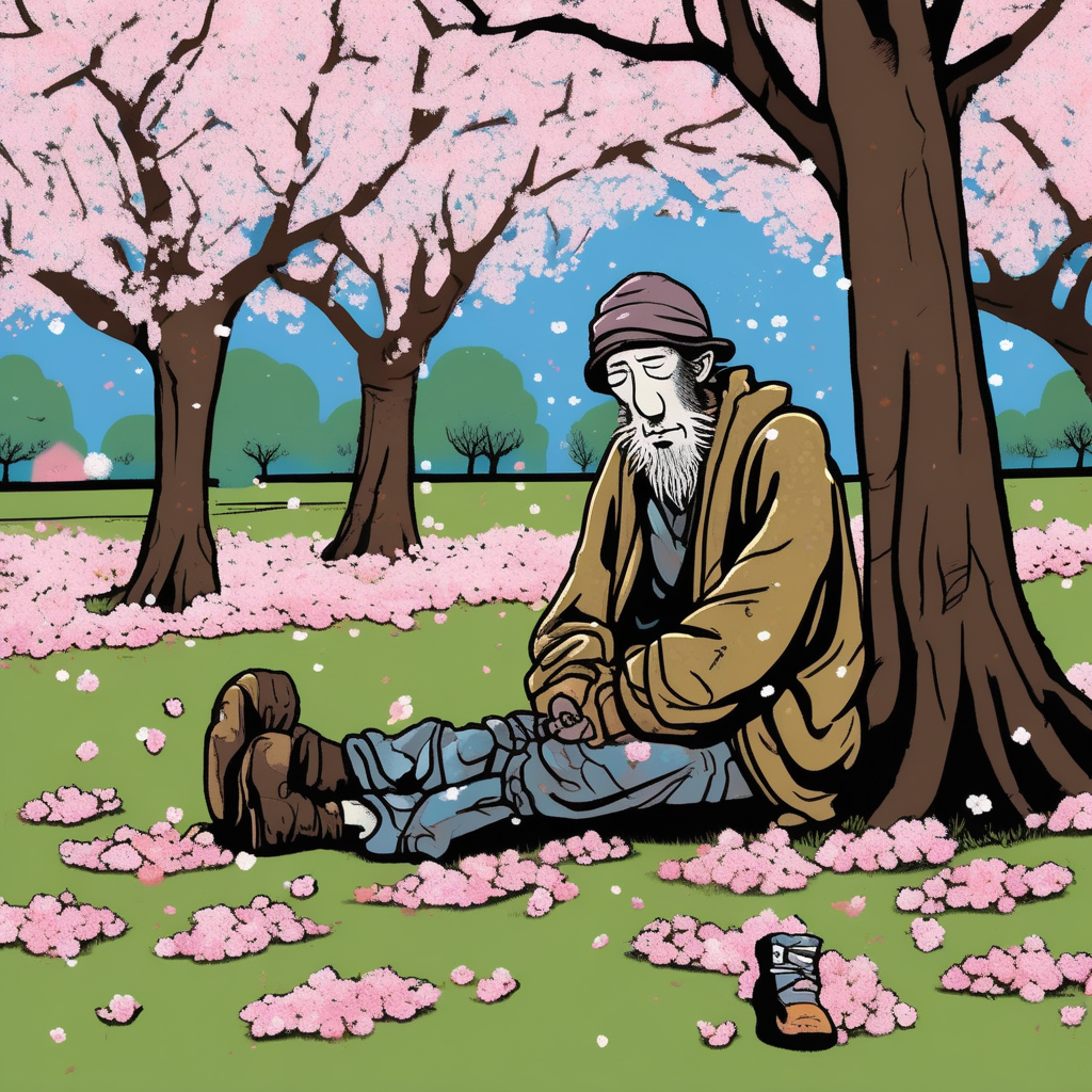 A vagrant finds peace among fragrant blooms, despite society's flagrant neglect