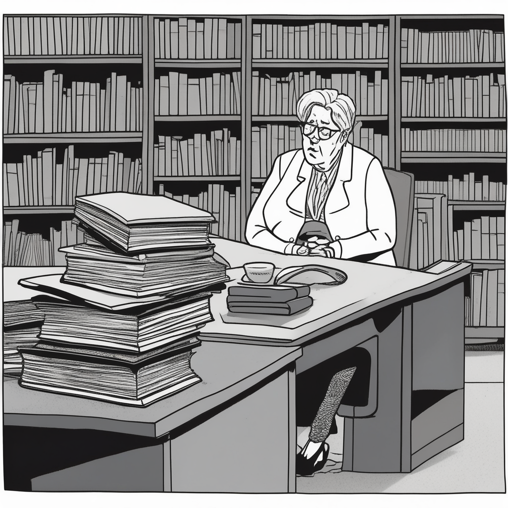 The morose librarian endures verbose chatter while patrons grow comatose