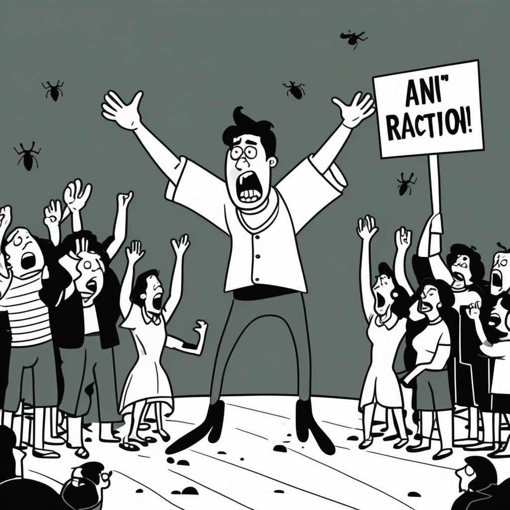 OVER + REACTION = dramatically overreacting to a tiny ant!