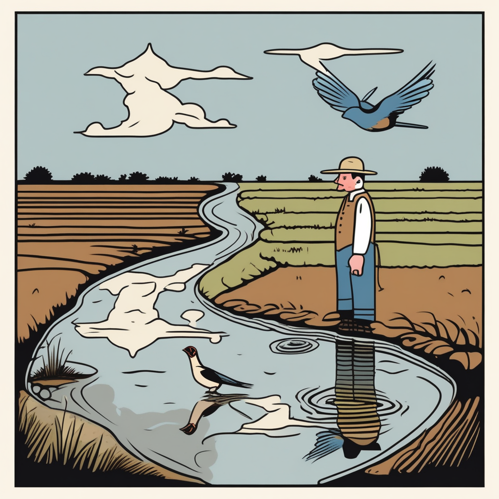 Above the fallow field, a swallow dips toward the shallow pool