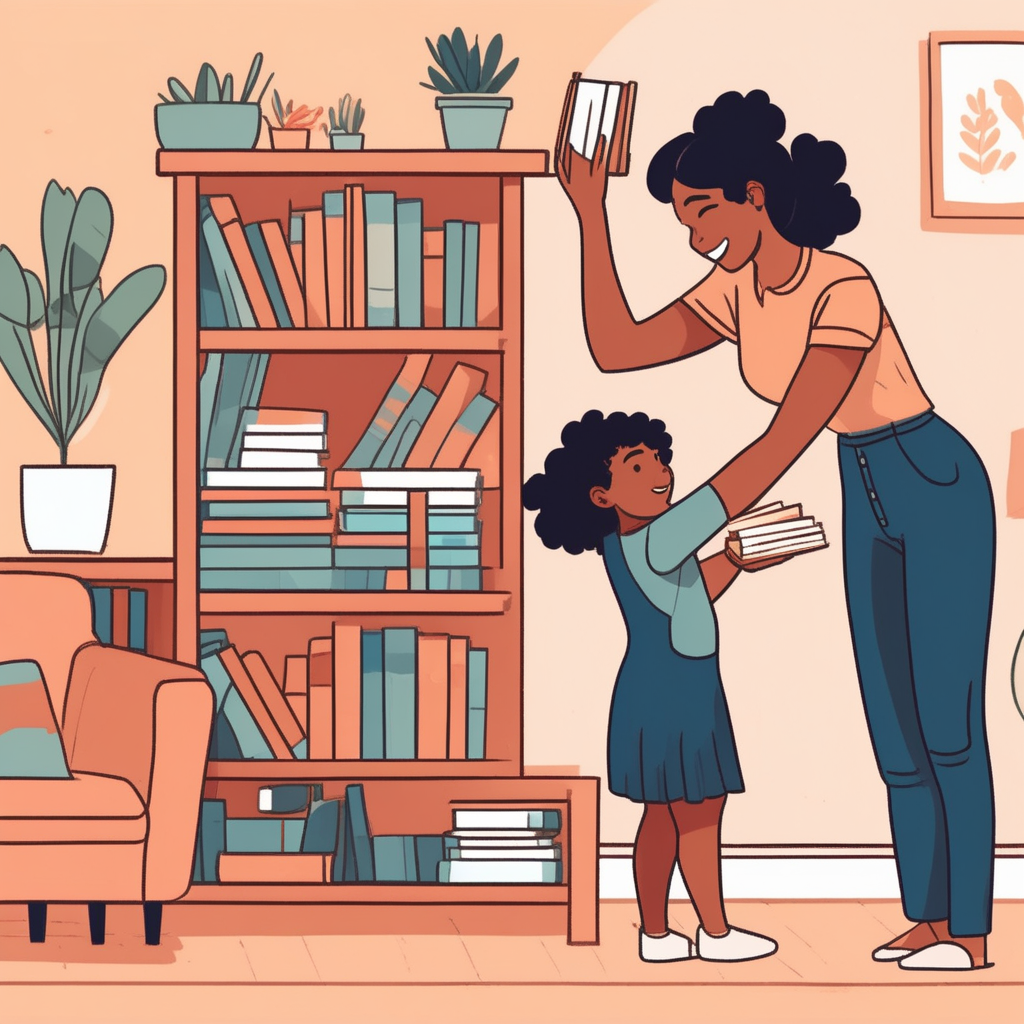 벽에 붙인 선반에 책을 정리하는 모습