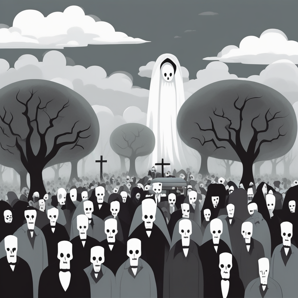Under the cloud, a mourning crowd gathers around the shroud