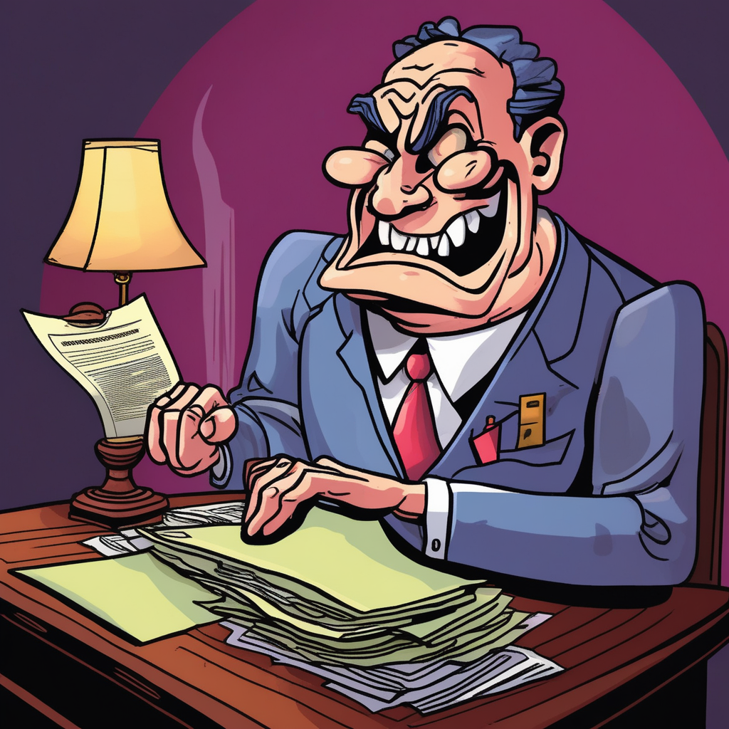 His hideous face shows devious joy over tedious schemes
