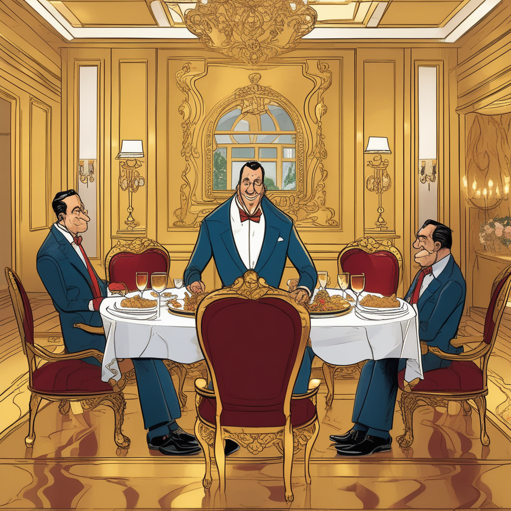 호화로운 자리에서 건방진 아첨꾼이 기름진 미소를 짓는다.
