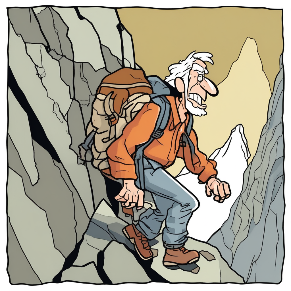 With ragged clothes and sagged pack, he climbs the jagged track!