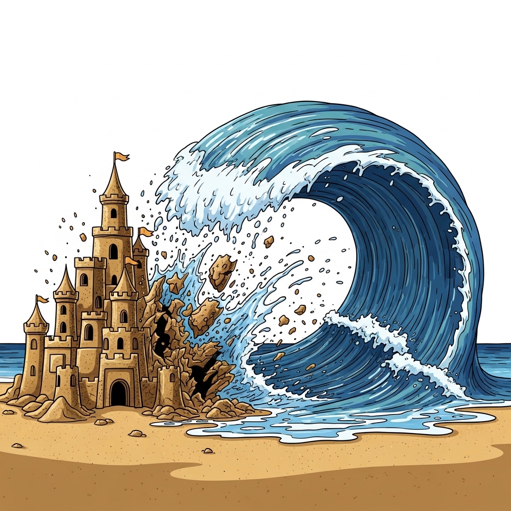 파도가 성을 완전히 휩쓸어 흔적조차 남기지 않는다.