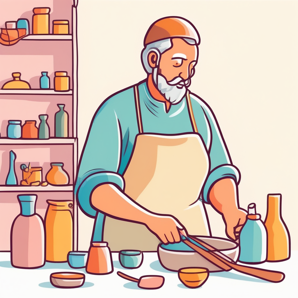 "The craftworker was so focused on his wood carving that he didn't notice his cat had stolen his lunch."