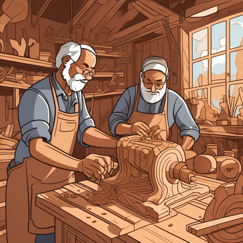 A craftworker trains a coworker, guided by a skilled woodworker!