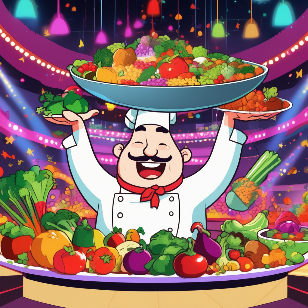 요리사가 버무리며 라이트 아래에서 다채로운 재료들을 섞고 있어요! 버라이어티 쇼처럼 다양해!