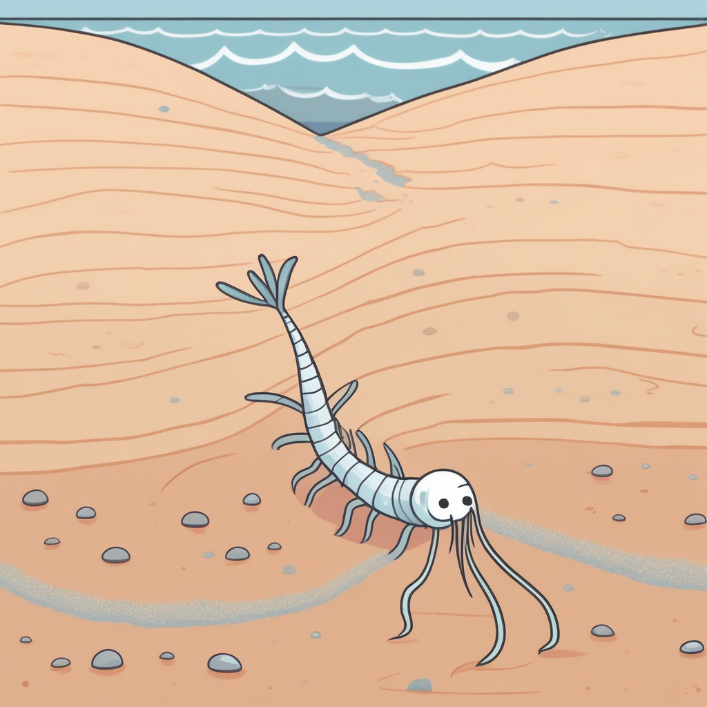 다친 새우가 절뚝절뚝, 모래에 구불구불 자국을 남기며